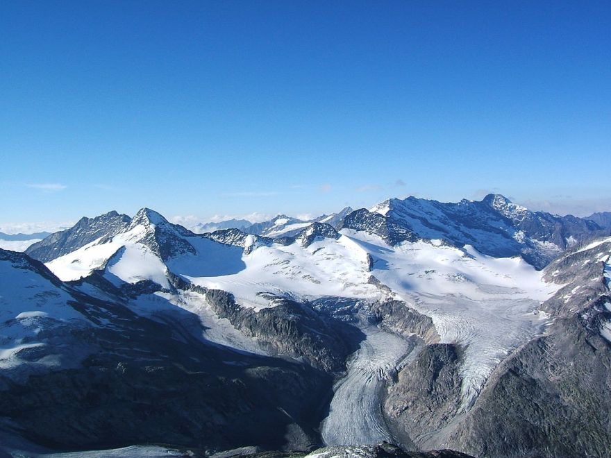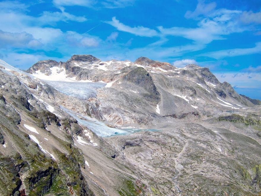 Meerdere gletsjers lopen tussen de Wiesbachhorn en de Kapruner Törl in de richting van de Mooserboden.
